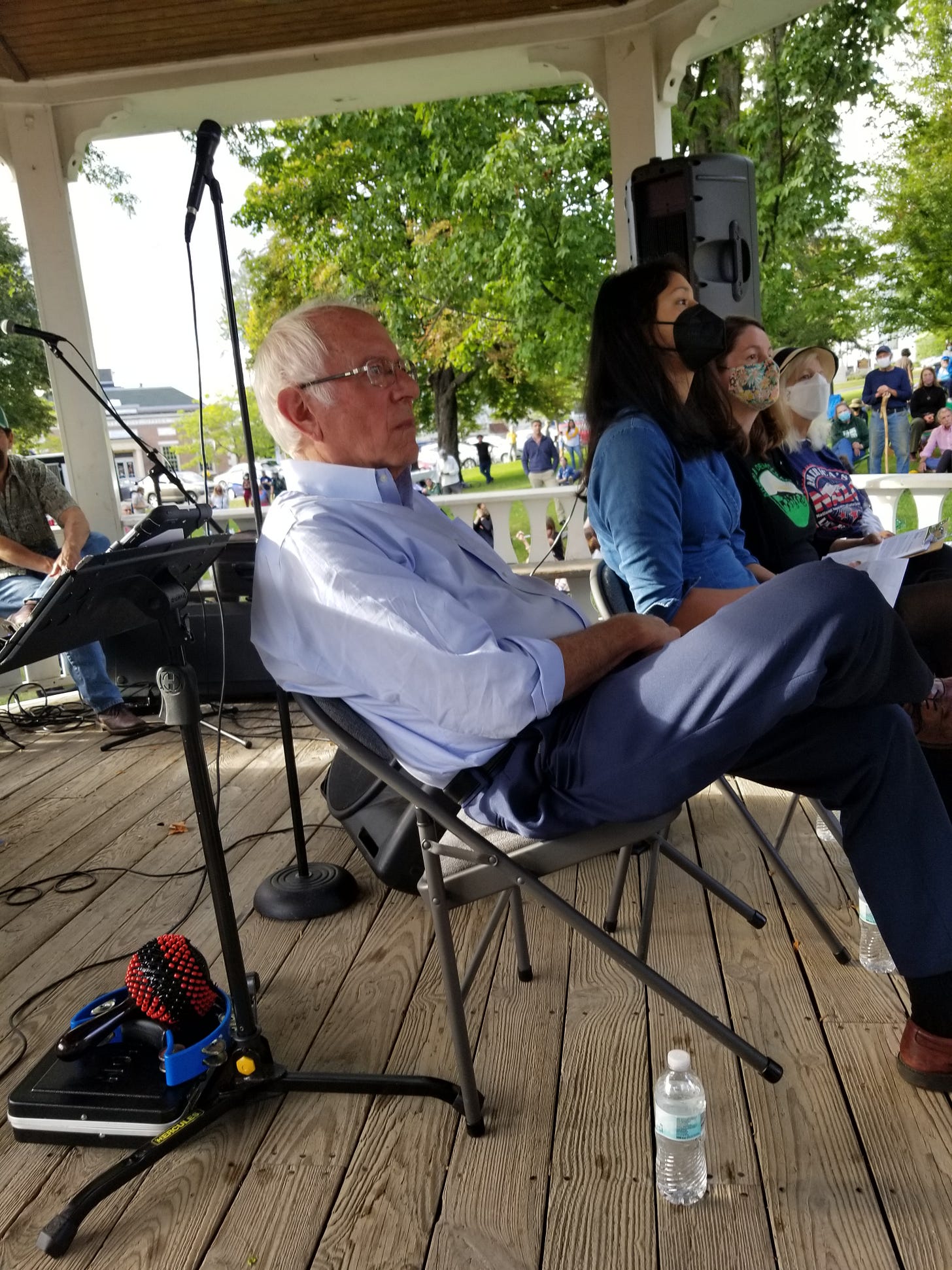 So Sanders has embarked on a nationwide speaking tour to build support, mostly in the crucial states of the Midwest. But for many years he has crisscrossed his own state of Vermont on Labor Day, ending up on the Green in Middlebury for a rally, and this year was no exception. I was there with him earlier this evening, to give a short speech of my own backing his plans and to listen as he explained to a crowd that spread out on the prototypical New England common exactly why the next few weeks were so important. (And also to interview him very briefly for the short pep talk recorded above).