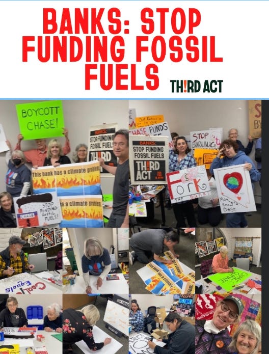 Tuesday will feature a hundred demonstrations in cities across 29 states, organized by fifty environmental and justice groups. It will have its own flavor, because the idea came from my colleagues at Third Act, which organizes people over the age of 60—that’s why, for instance, many of us will be blocking bank doors in rocking chairs in downtown DC. The target across the country will be Chase, Citibank, Wells-Fargo, and Bank of America—the four biggest American banks, and the planet’s four biggest lenders to the fossil fuel industry. And the message will be clear and simple: stop funding fossil fuel expansion.