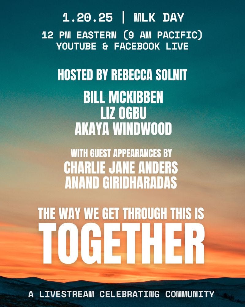 Oh, and if you want something to do that doesn’t involve watching the inauguration tomorrow, you can join Rebecca Solnit, Akaya Windwood, Liz Ogbu, me, and some other friends for a livestream at the same time. Remember, tomorrow is more than the inaugural, it’s also the celebration of the life of Dr. King, who would have turned 95 last week. For the moment his life’s work seems in question, but surely his call to love will ultimately prevail over Trump’s appeal to hate. We must, at least, try to make it so.