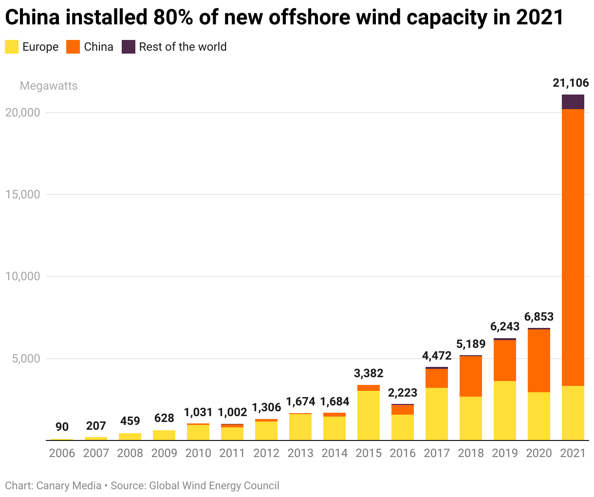 You know who seems to have figured that out? China. New figures released last week show that fully 80 percent of all the offshore wind generation installed on the planet last year was in the water surrounding China.
