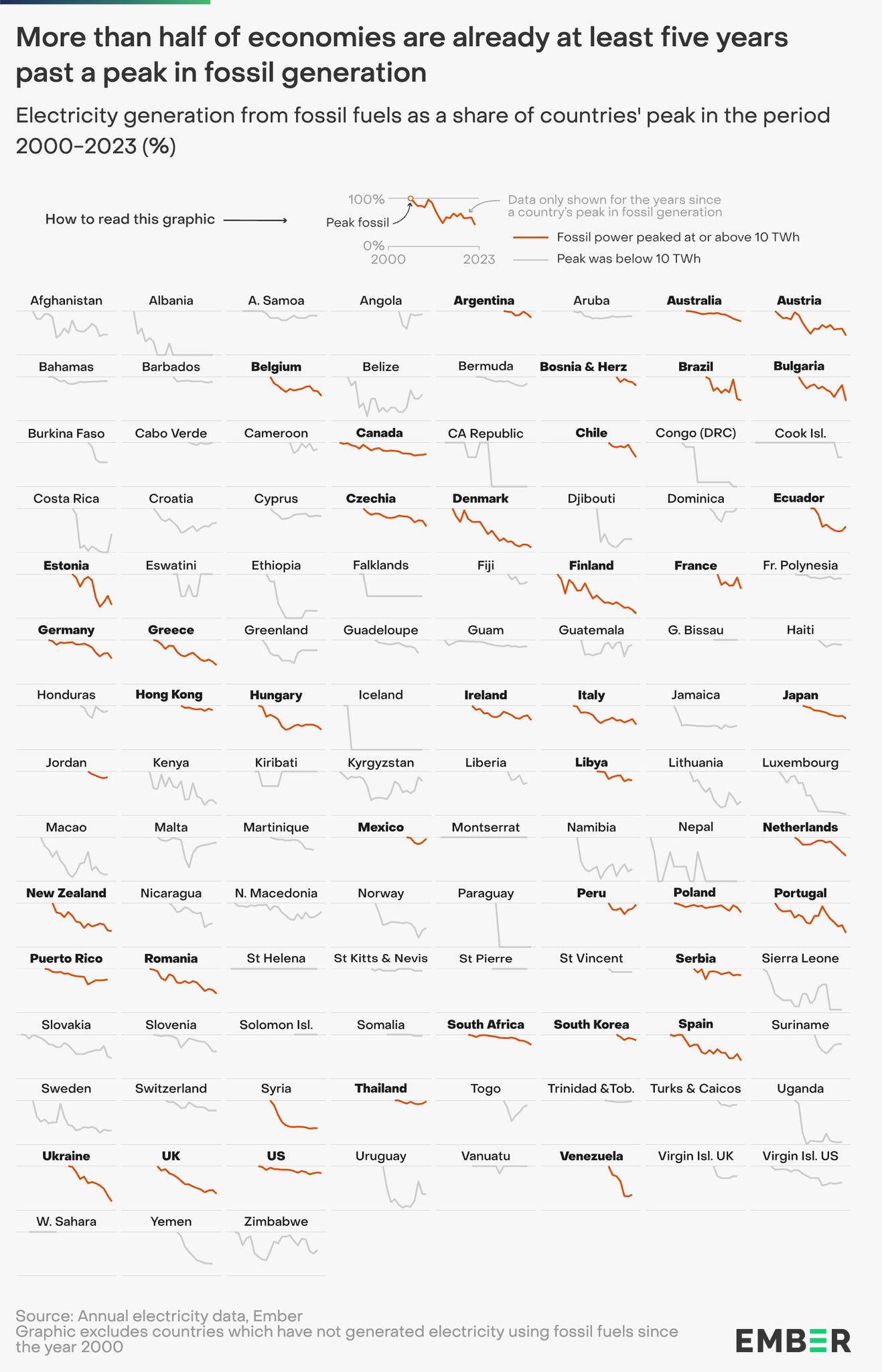 +Fascinating graph, courtesy of the data mavens at Ember, shows that 51 countries have now seen their fossil fuel emissions from power generation drop dramatically. It’s a sign that renewables aren’t just adding to the power sector, but beginning to substitute for fossil fuels