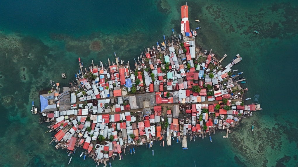 Considerably more tragically, a group of indigenous in Panama are having to abandon the small island where they’ve lived for two hundred years as the sea rises. Here’s a picture of Gardi Sugdub, crowded with homes that will soon be empty