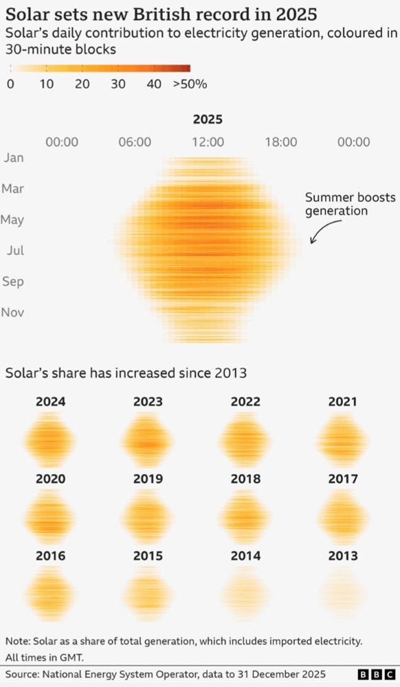 +Best graphic of the new year comes from the BBC, which has figured out a way to illustrate how solar power is growing in the UK. And hey, we need something warm to end on this bleak day.