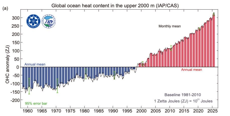+We carefully measure the atmospheric temperature, and as you know 2023, 2024, and 2025 have been the three hottest years on record. But forces like the El Niño and La Niña currents in the Pacific can send those numbers a little up and down every year; a much more stable record comes from the heat content of the ocean, and it builds inexorably, year after year. The latest, from Michael Mann et al, in Advances in Atmospheric Science