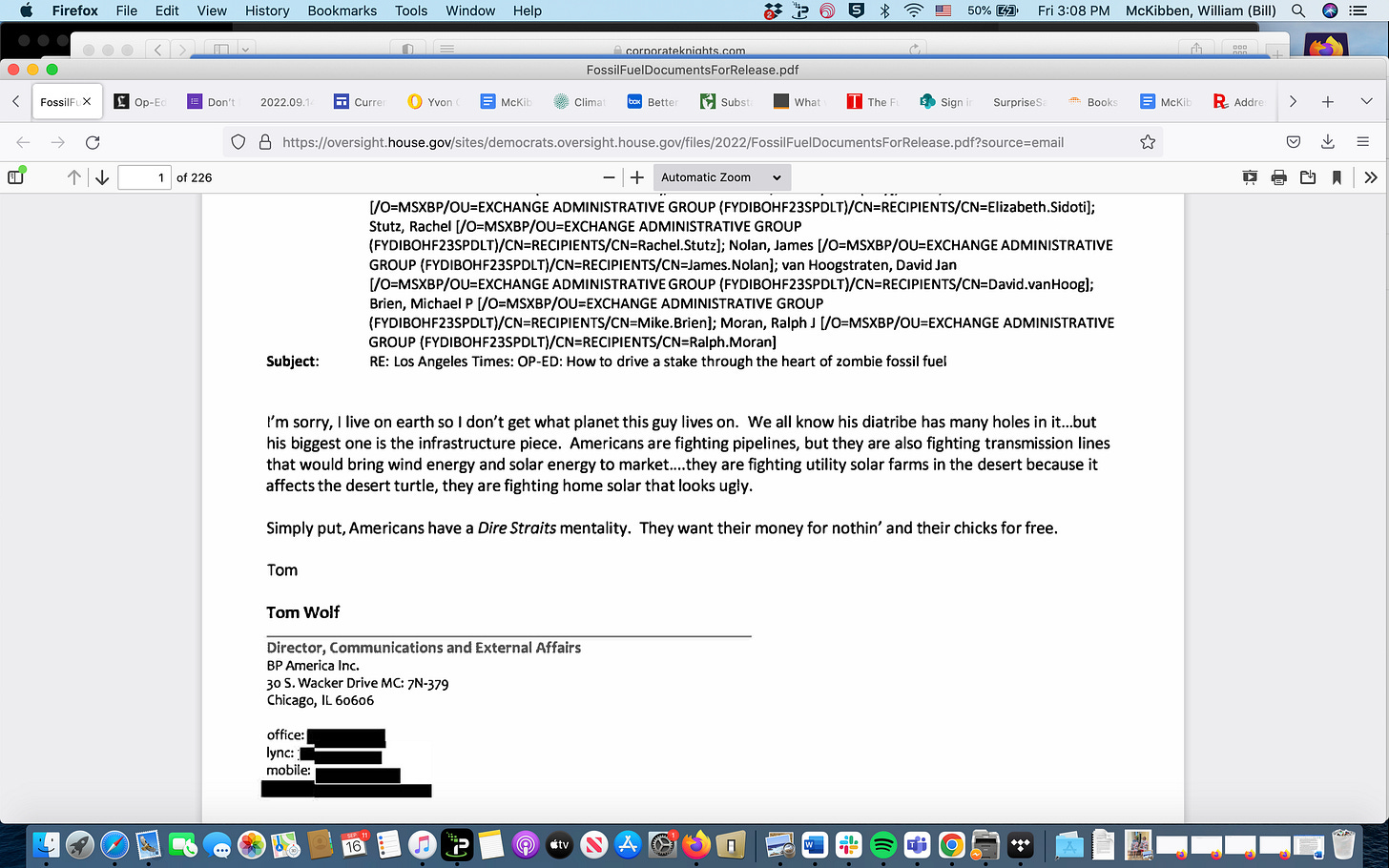 From what one can decipher from the email chain, a woman named Virginia Northington, who once had worked for the great historian Douglas Brinkley, later joined something called the Brunswick Group which “helps companies navigate a complex array of societal challenges, as well as articulating a company’s ‘purpose,’” and whose “Climate Hub helps businesses respond to climate change.” There Ms. Northington went to work “advis[ing] American, British, and European clients on litigation and crisis mandates,” which in the spring of 2016 (i.e. right after the Paris climate accords) apparently meant clipping out opeds from me and forwarding them to a long list of BP executives. One of those executives, Robert Stout, now a vice-president for regulatory policy and advocacy, responded that the Los Angeles Times essay she’d passed around was a “must-read,” which is a nice thing to say but I don’t think he meant it that way. One of his employees, the director of communications and external affairs, responded in more heartfelt fashion. As Mr. Tom Wolf wrote to a long list of colleagues as follows: