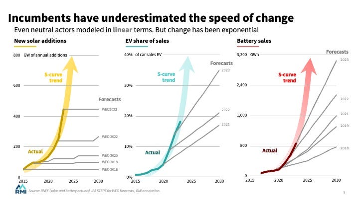 So even amidst all the desperate news from climate science, I have some legitimately good numbers to update you on this morning. They come from the veteran energy analyst Kingsmill Bond and colleagues at the Rocky Mountain Institute, and they demonstrate that the world has moved on to the steep part of the S curve, which will sweep us from minimal reliance on renewable energy to—we must hope and pray— minimal dependence on fossil fuel. The angle of that curve may prove to be the most significant geometry of our time on earth, competing only with the slope of the Keeling Curve which documents the growing accumulation of co2 in the atmosphere above Mauna Loa.